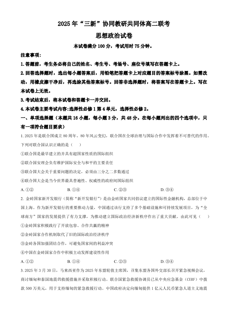 江西省2025年“三新”协同教研共同体高二联考 政治试卷(含答案).pdf