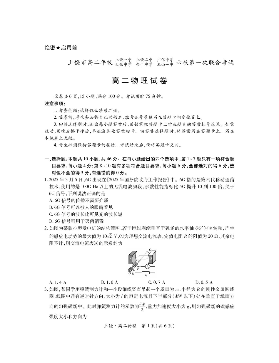 江西省上饶市六校2024-2025学年高二下学期第一次联合考试 物理试卷(含答案).pdf