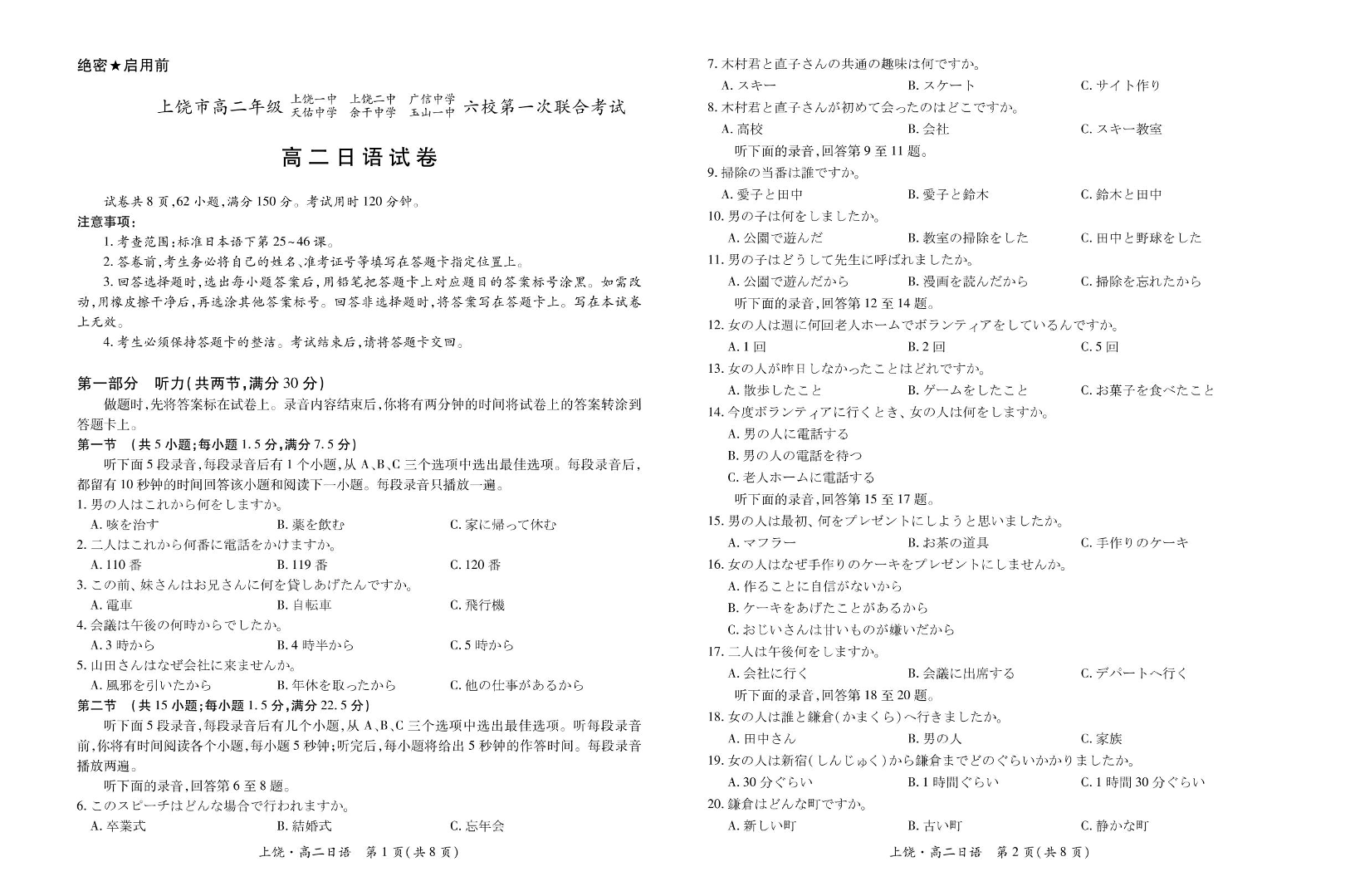 江西省上饶市六校2024-2025学年高二下学期第一次联合考试 日语试卷(含答案).pdf