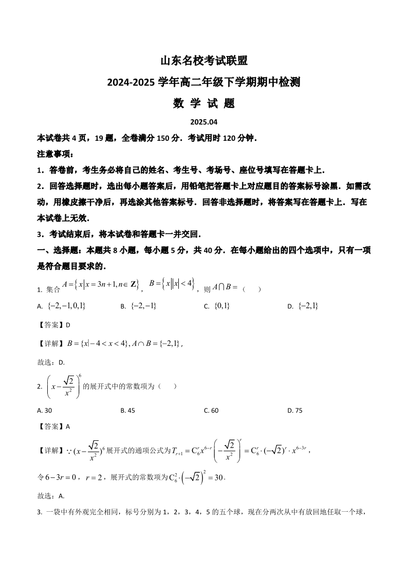 山东名校考试联盟2024-2025学年高二年级下学期期中检测 数学试卷(含答案).pdf
