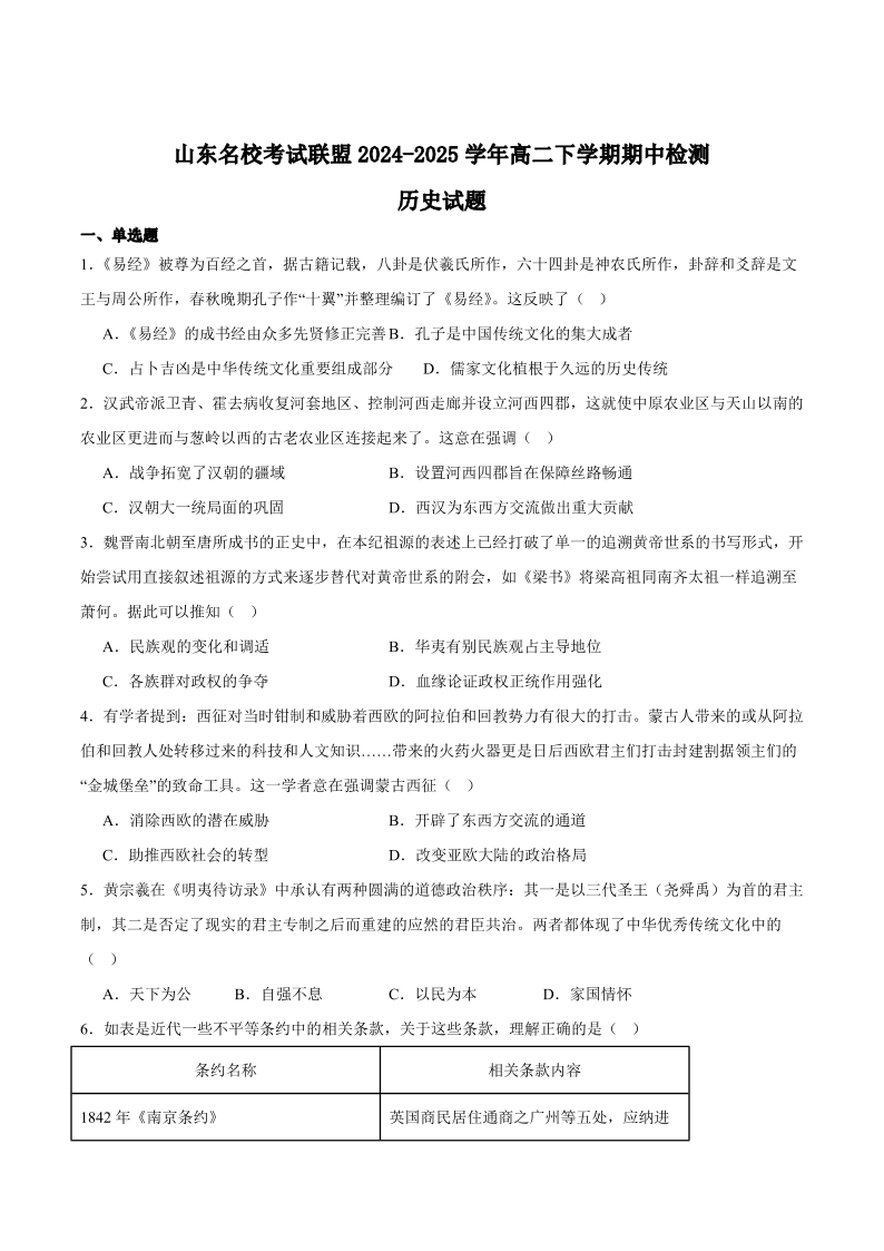 山东名校考试联盟2024-2025学年高二年级下学期期中检测 历史试卷(含答案).pdf