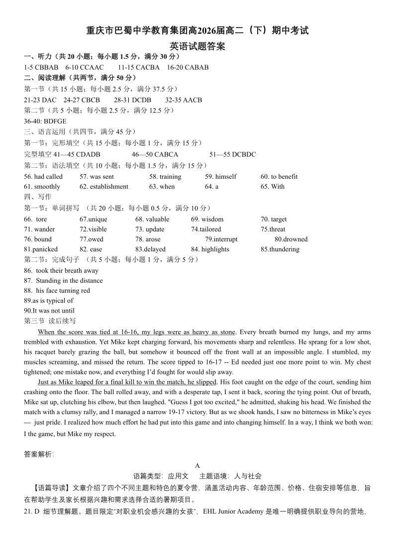 巴蜀中学高二下半期 英语答案.pdf