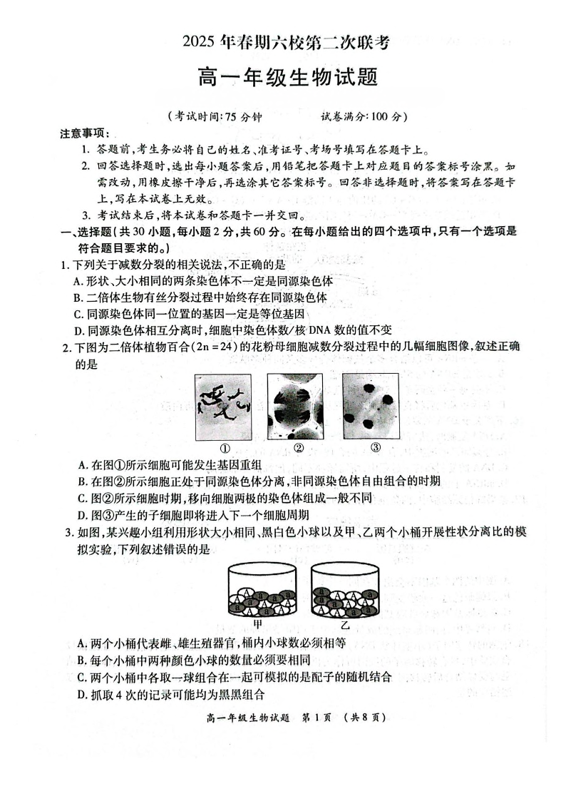 河南省南阳市2025年春期六校高一年级第二次联考 生物试卷(含答案).pdf