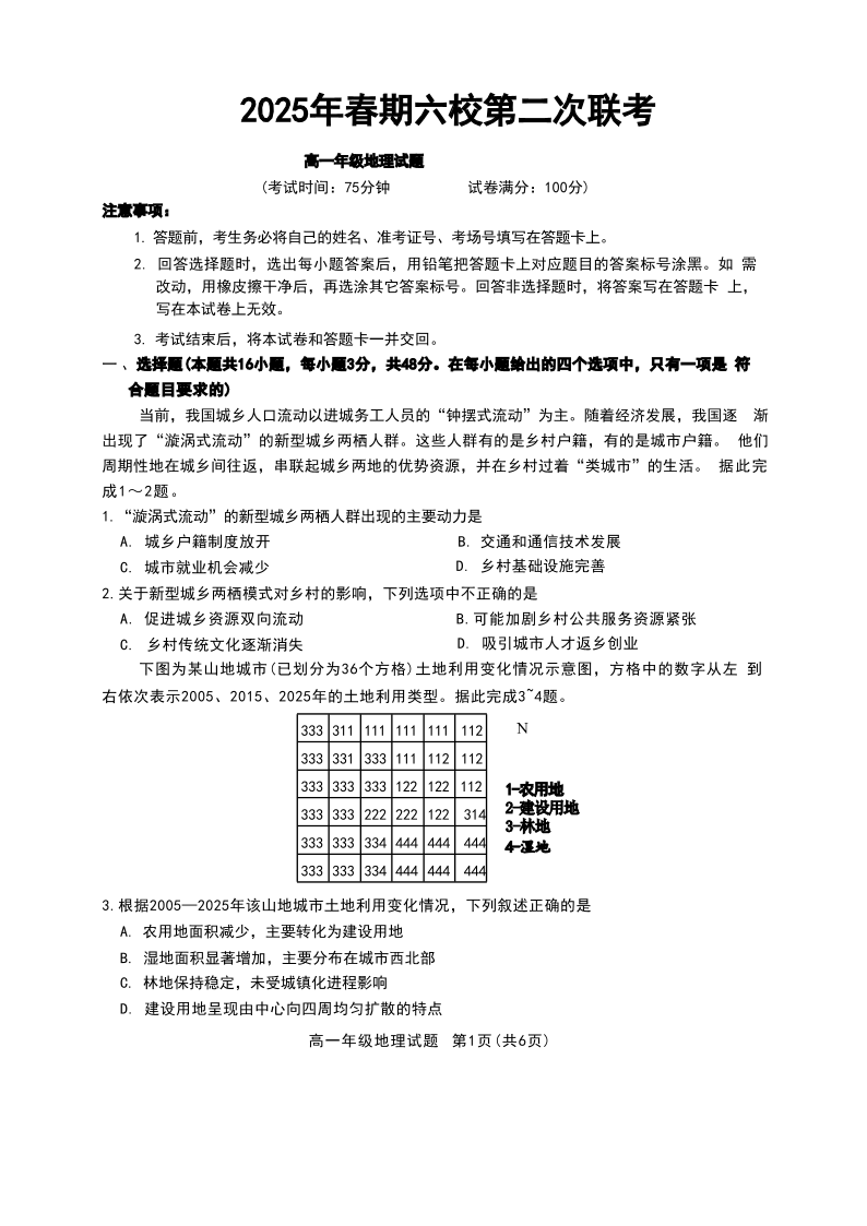 河南省南阳市2025年春期六校高一年级第二次联考 地理试卷(含答案).pdf