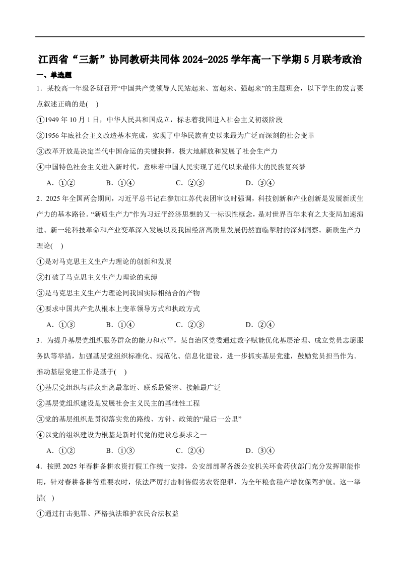 江西省2025年“三新”协同教研共同体高一联考 政治试卷(含答案).pdf