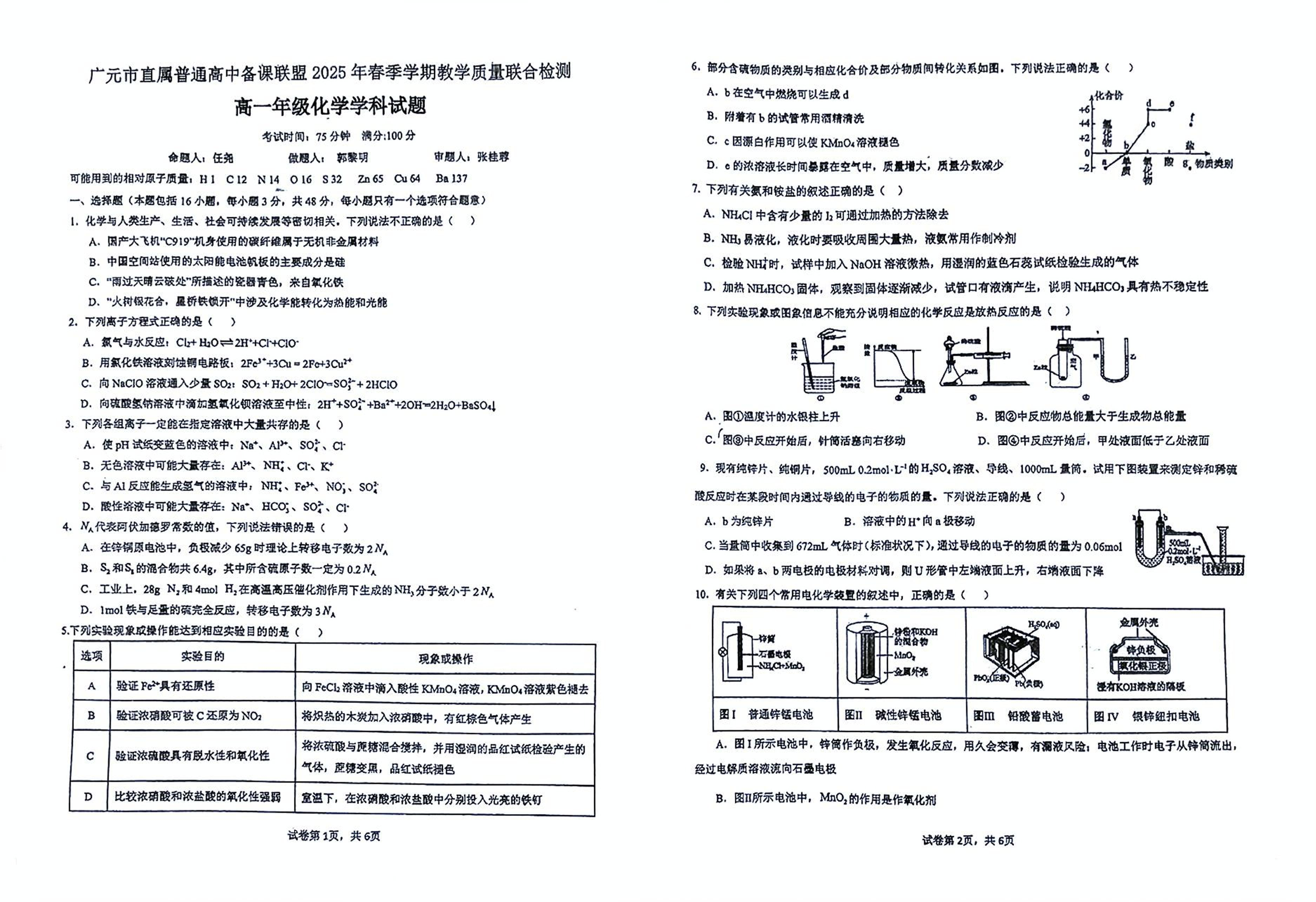 四川省广元市直属普通高中2024-2025学年高一下学期期中考试 化学试卷(含答案).pdf