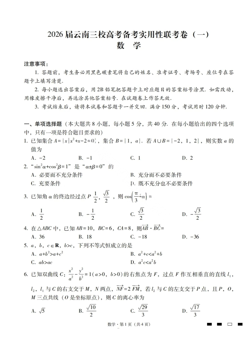 2026届云南三校高考备考实用性联考卷(一)数学试卷+答案.pdf