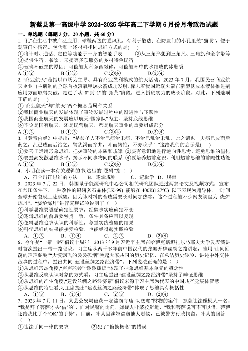 新蔡第一高级中学2024-2025学年高二下学期6月月考 政治试题(含答案).pdf