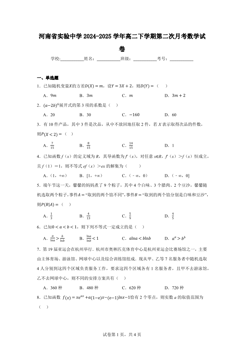 河南省实验中学2024-2025学年高二下学期第二次月考 数学试卷(含答案).pdf