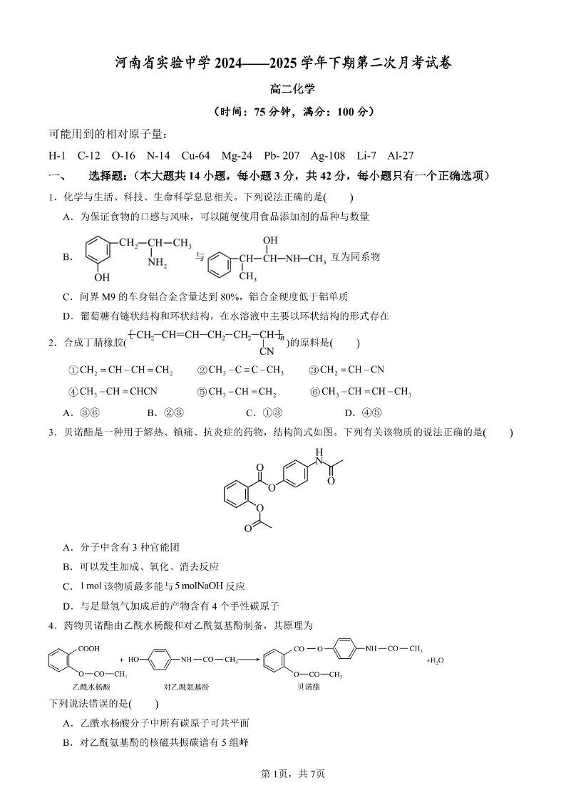 河南省实验中学2024-2025学年高二下学期第二次月考 化学试卷(含答案).pdf