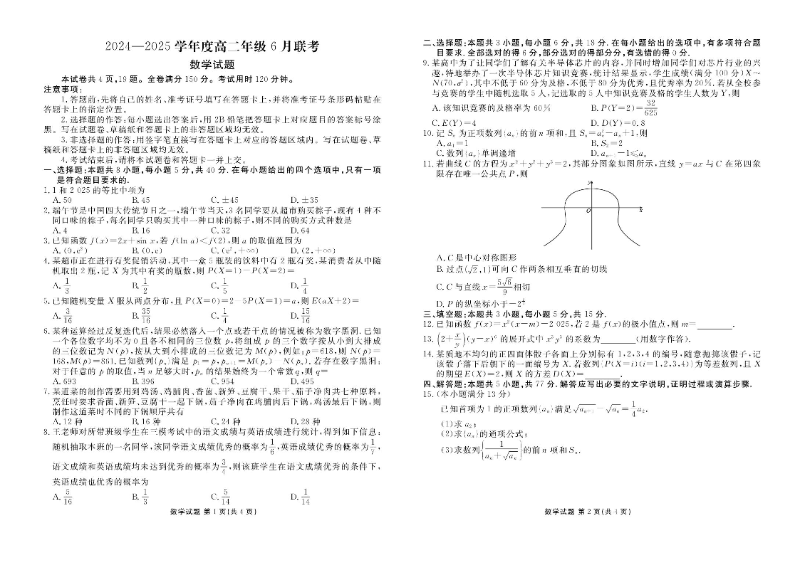 衡水金卷2024-2025学年度高二年级6月联考 数学试题(含答案).pdf