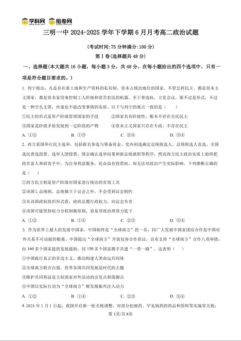 福建省三明第一中学2024-2025学年高二下学期6月月考 政治.docx