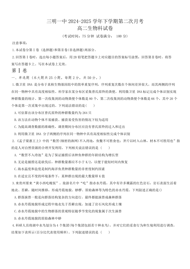福建省三明第一中学2024-2025学年高二下学期6月月考 生物试题(含答案).docx