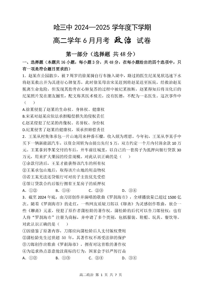 哈三中2024-2025学年度下学期高二学年6月月考 政治.pdf
