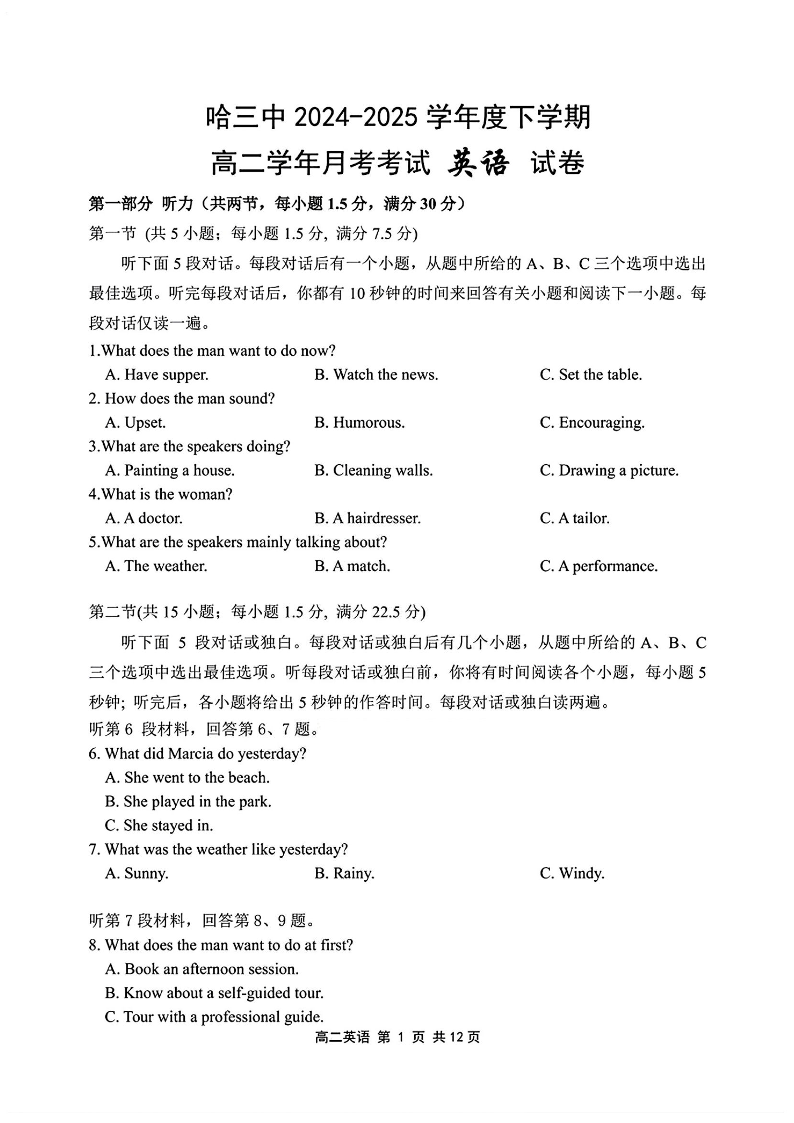 哈三中2024-2025学年度下学期高二学年6月月考 英语(含答案).pdf