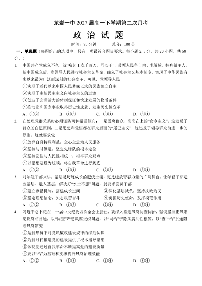 福建省龙岩第一中学2024-2025学年高一下学期第二次月考 政治试卷(含答案).pdf