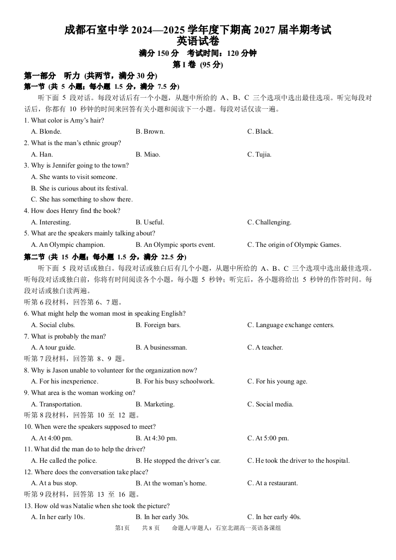 成都石室中学2024-2025学年度下期高2027届期中考试 英语.pdf