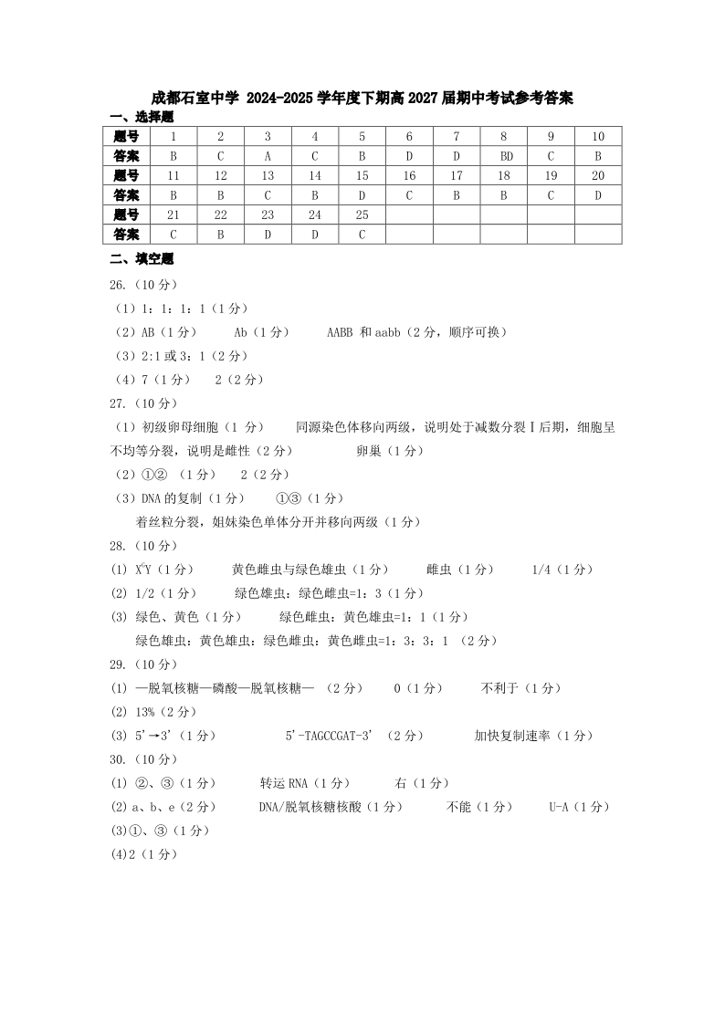 成都石室中学2024-2025学年度下期高2027届期中考试 生物答案.pdf