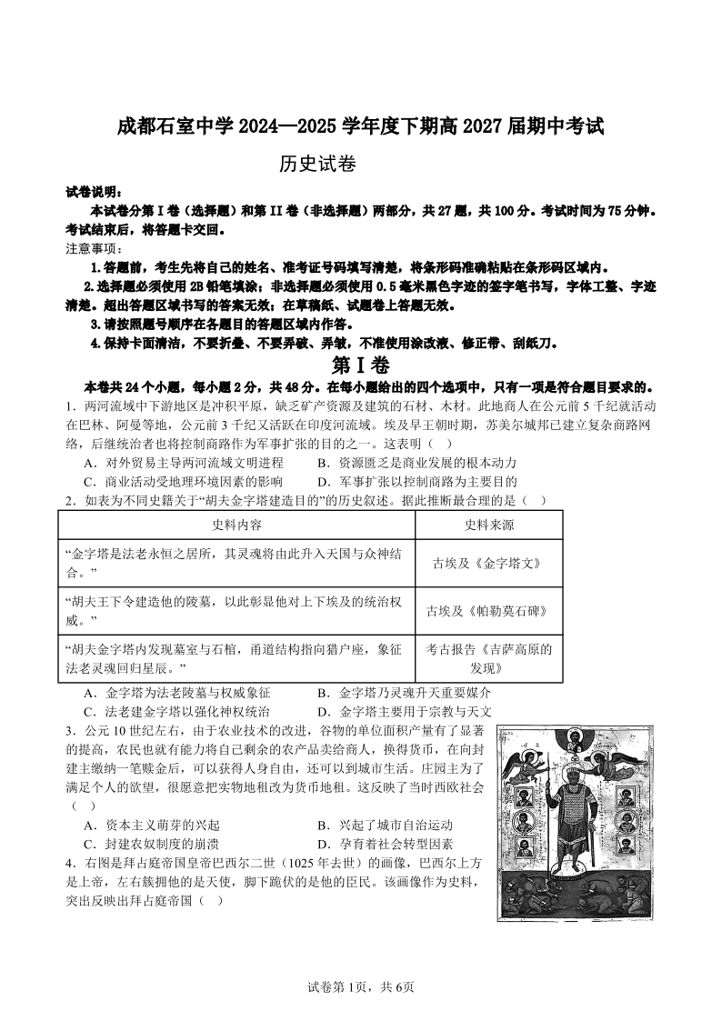 成都石室中学2024-2025学年度下期高2027届期中考试 历史.pdf