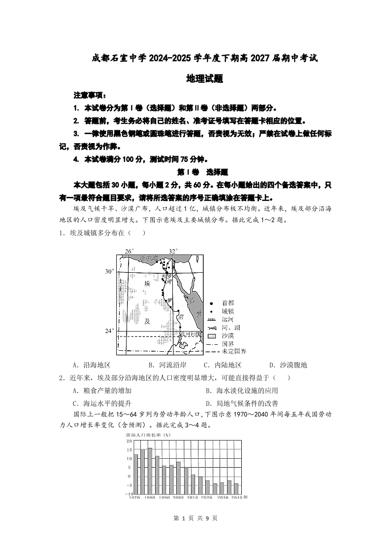 成都石室中学2024-2025学年度下期高2027届期中考试 地理.pdf