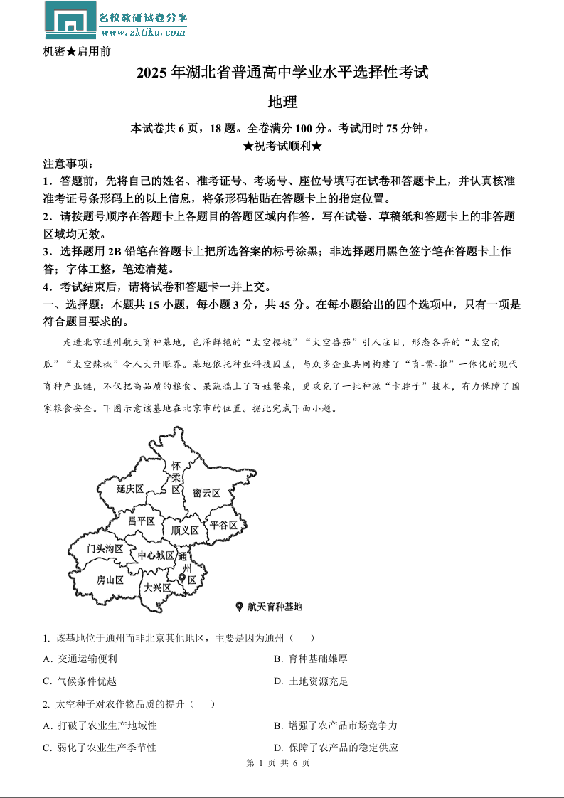 2025年湖北高考地理真题.docx