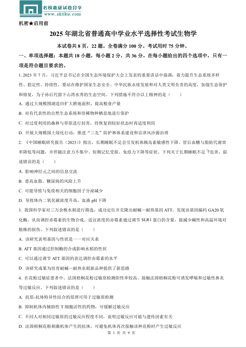 2025年高考湖北卷生物真题试卷.docx