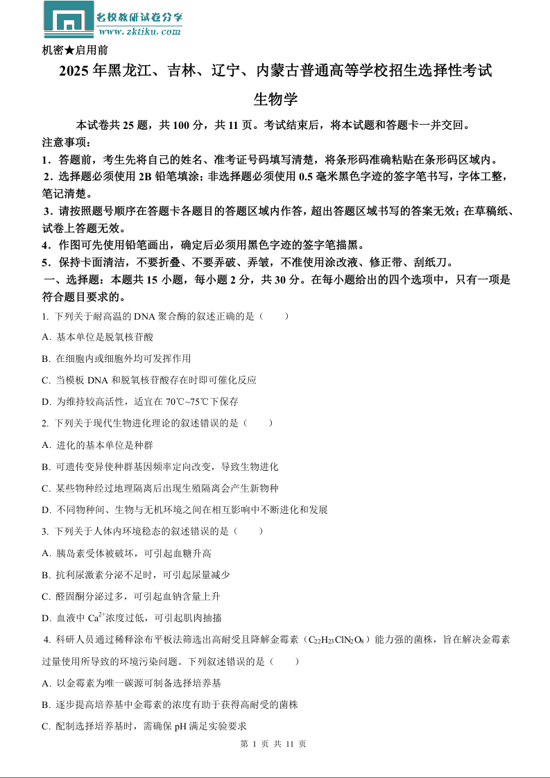 2025年黑龙江、吉林、辽宁、内蒙古高考生物真题试卷.docx