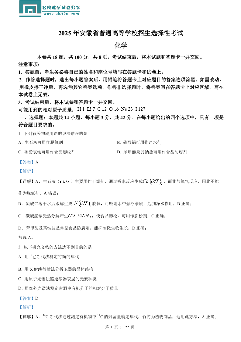 2025年安徽高考真题化学试题(含解析).docx