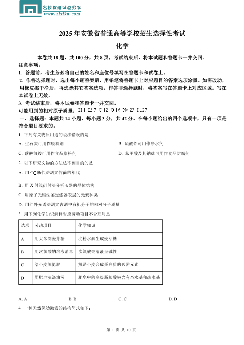 2025年安徽高考真题化学试题.docx