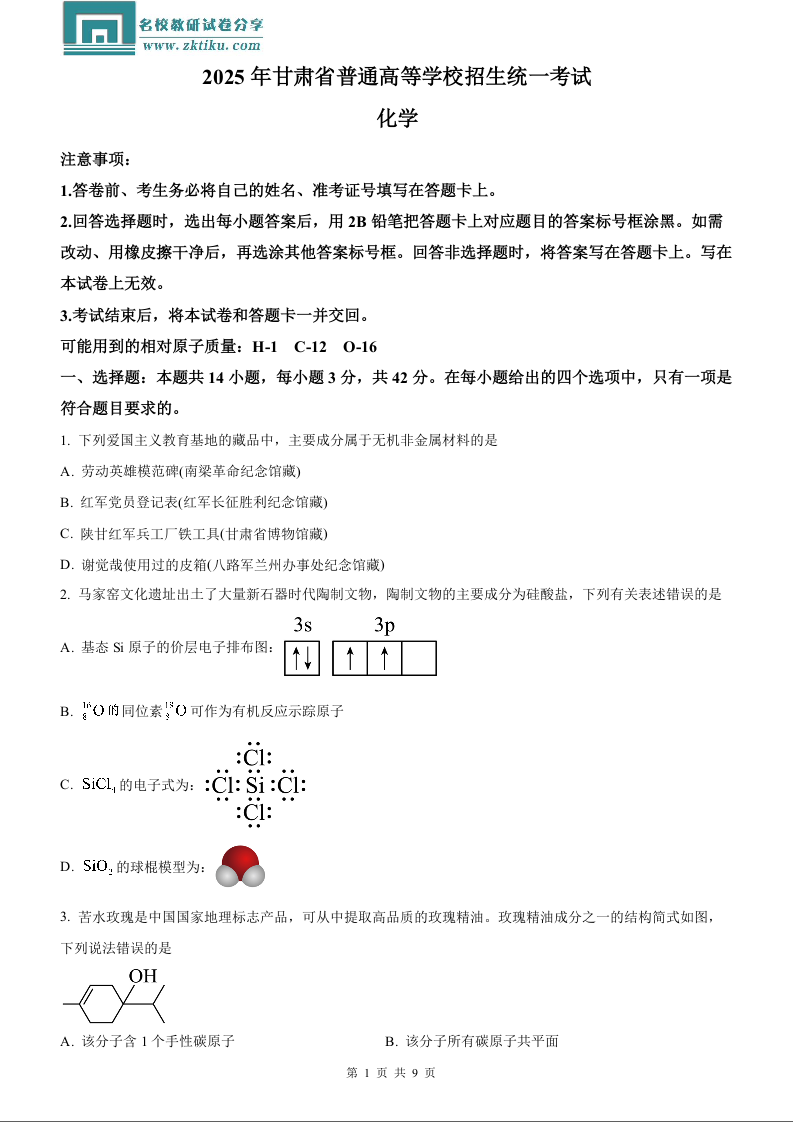 2025年甘肃高考真题化学试题.docx
