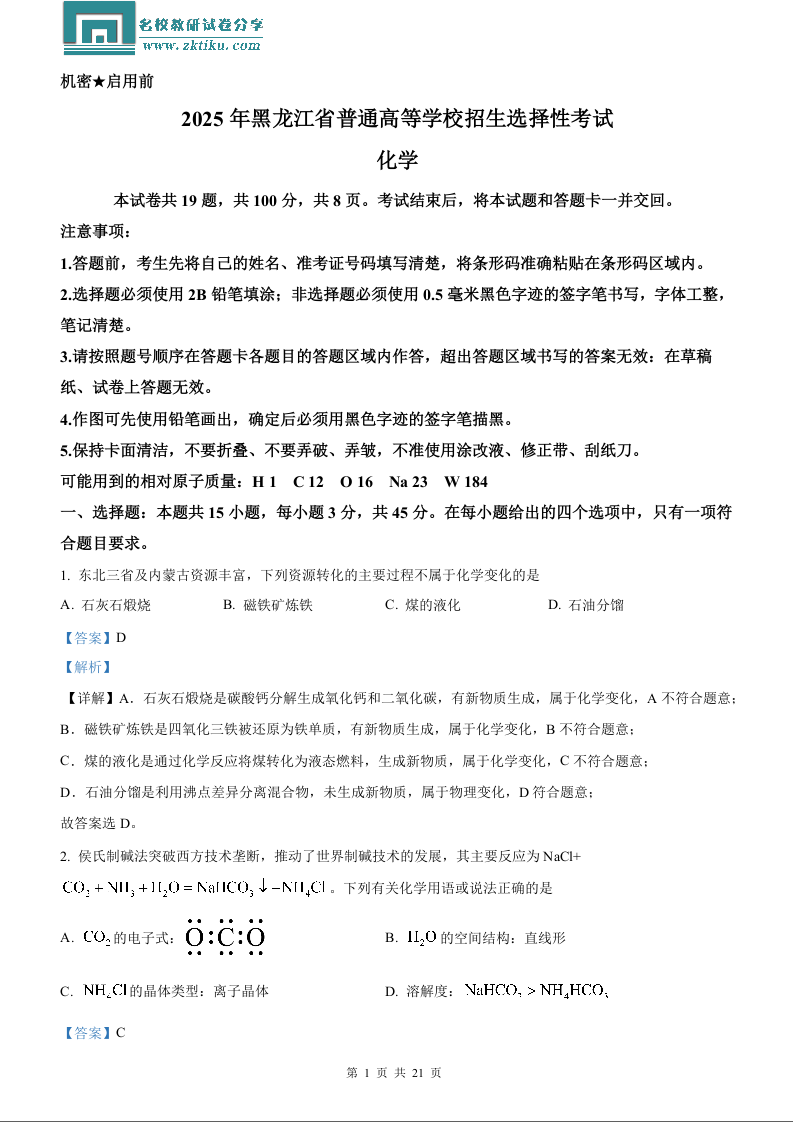 2025年黑龙江、吉林、辽宁、内蒙古高考化学真题(含解析).docx