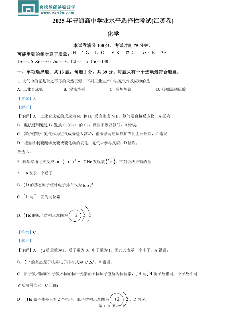 2025年江苏高考真题化学试题(含解析).docx