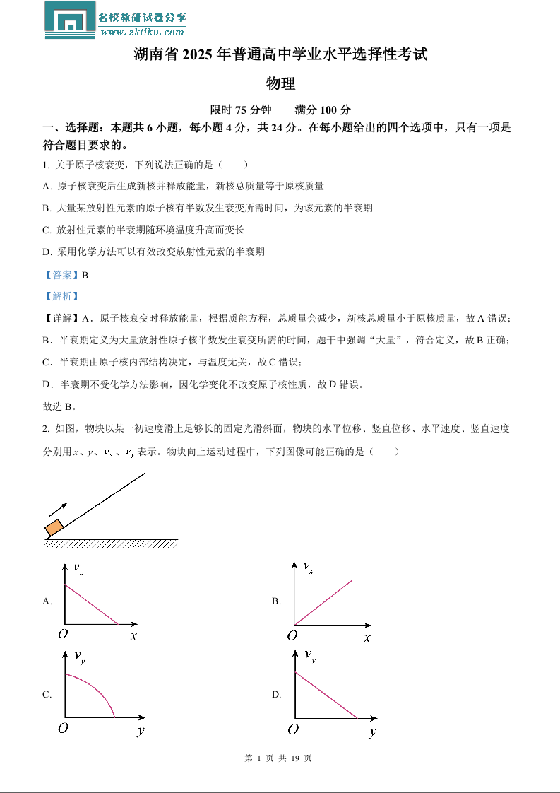 2025年高考湖南卷物理真题(含解析).docx