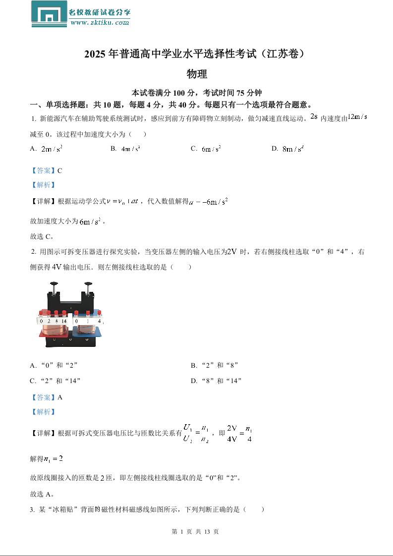 2025年高考江苏卷物理真题(含解析).docx
