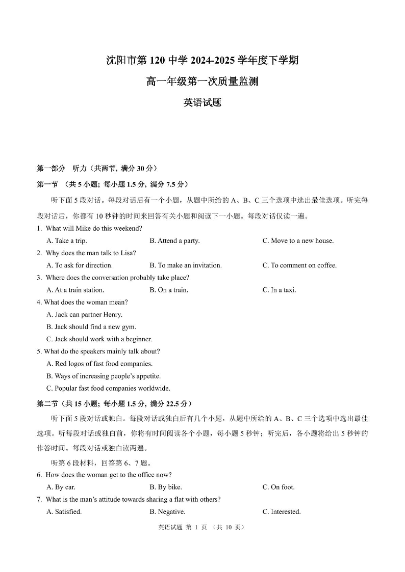沈阳市第120中学2024-2025学年高一下学期第一次质量监测 英语试卷(含答案).pdf