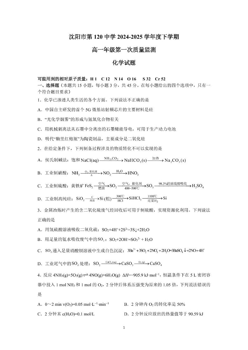 沈阳市第120中学2024-2025学年高一下学期第一次质量监测 化学试卷(含答案).pdf