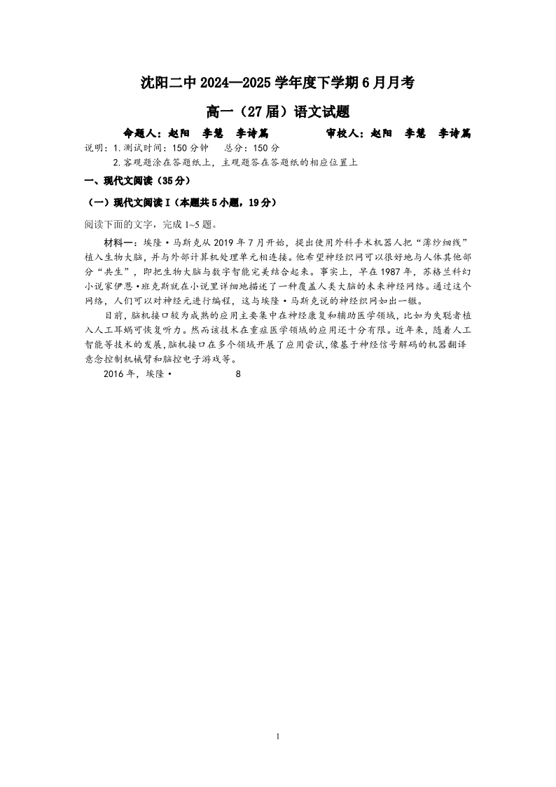 沈阳二中2024-2025学年度下学期6月月考 语文试卷(含答案).pdf
