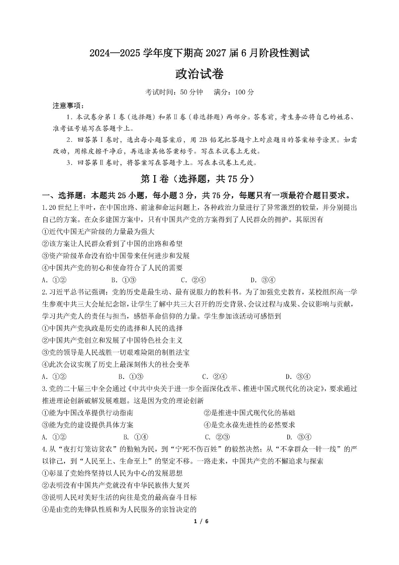四川省成都市第七中学2024-2025学年高一下学期6月月考 政治(含答案).pdf