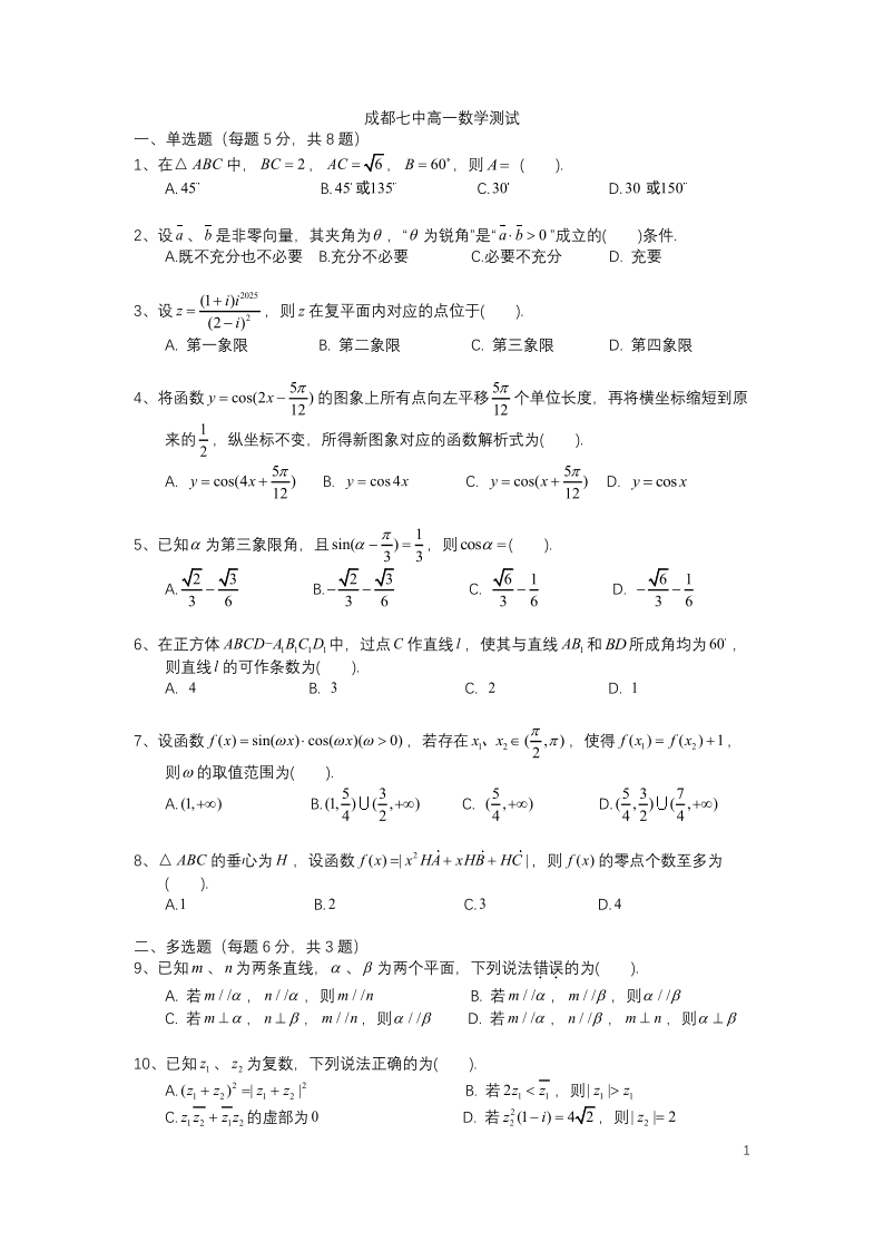 四川省成都市第七中学2024-2025学年高一下学期6月月考 数学(含答案).pdf