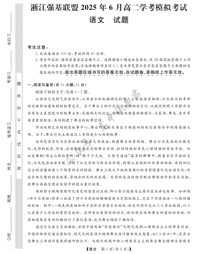 浙江省强基联盟2025年6月高二学考模拟考试 语文试题(含答案).pdf