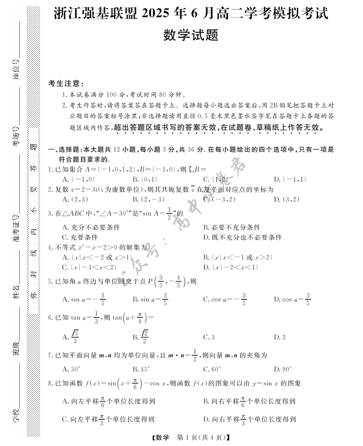 浙江省强基联盟2025年6月高二学考模拟考试 数学试题(含答案).pdf