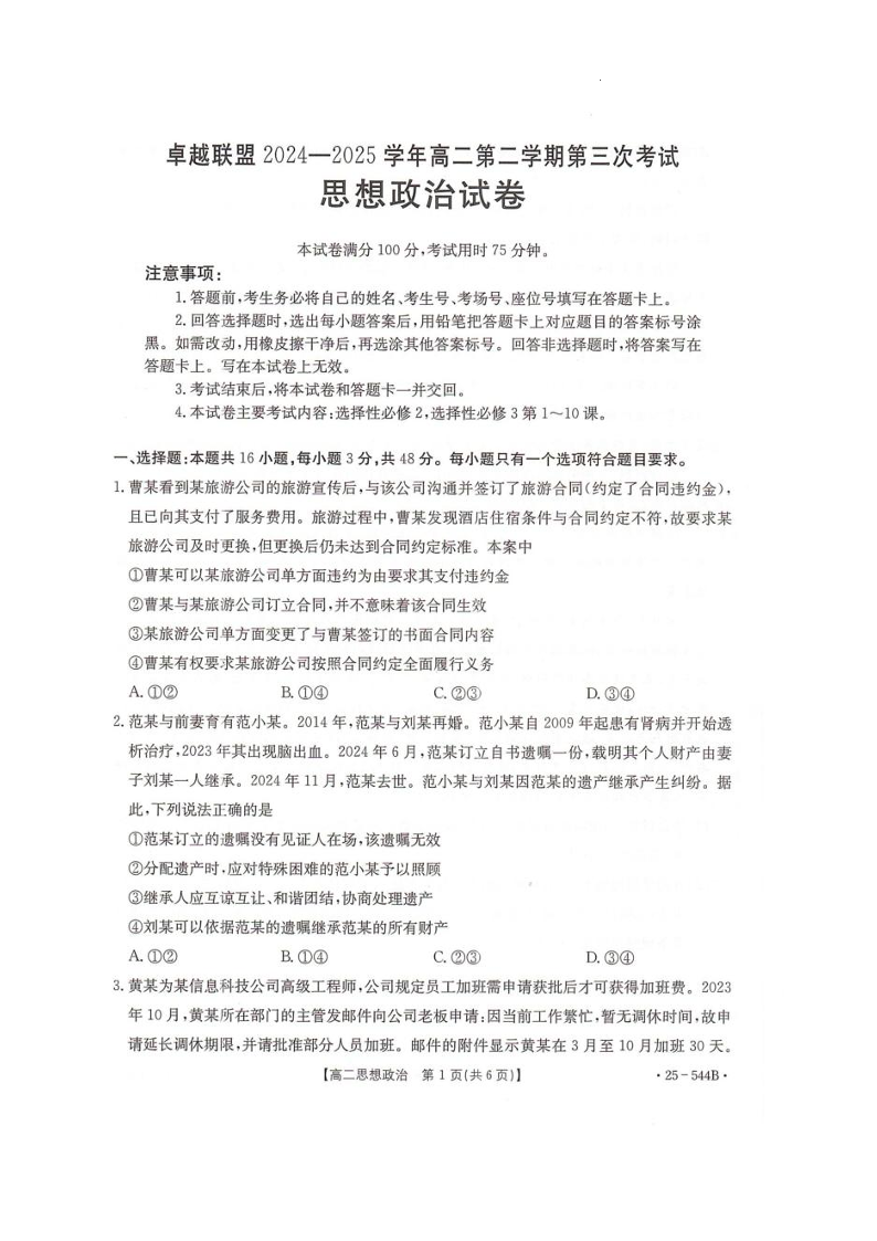 河北省邢台市卓越联盟2024-2025学年高二下学期第三次考试(6月)政治试卷(含答案).pdf