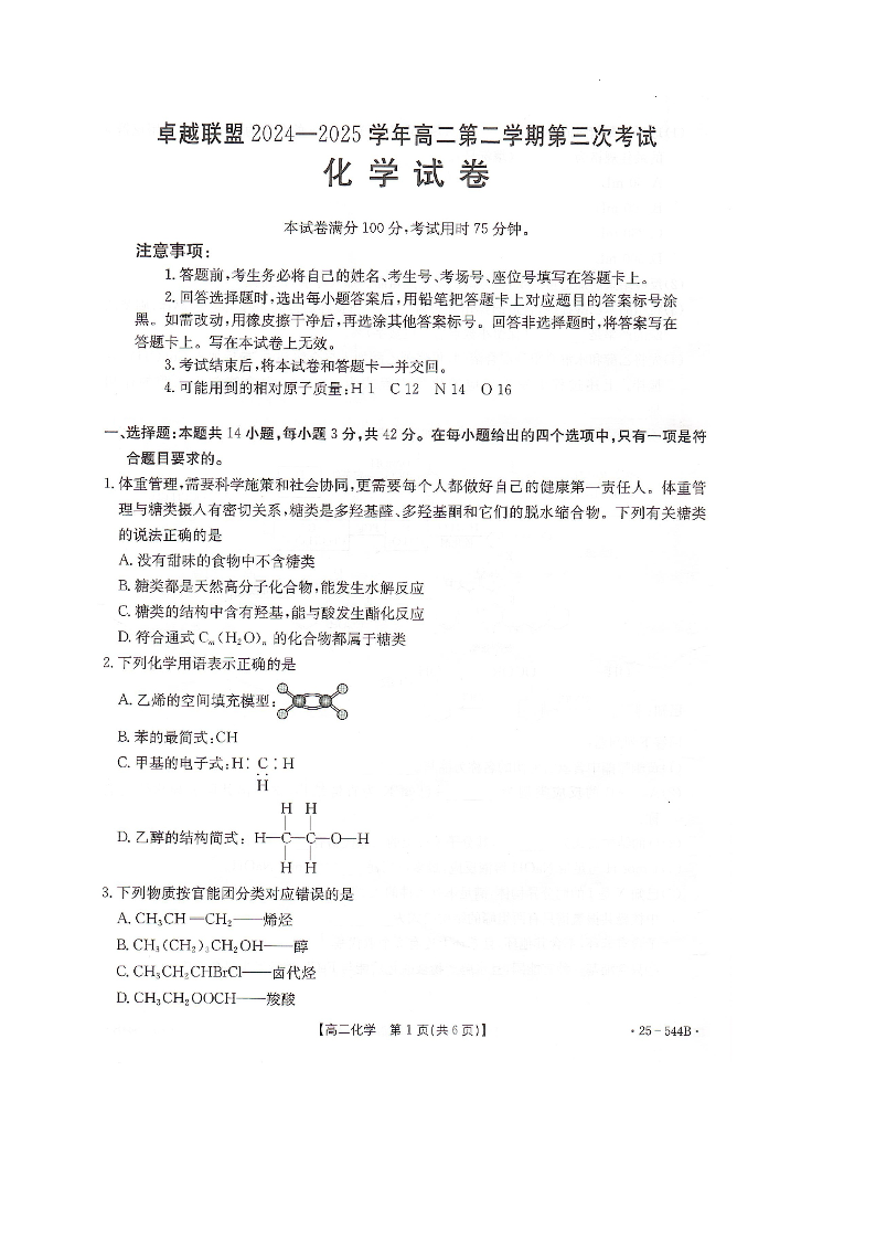 河北省邢台市卓越联盟2024-2025学年高二下学期第三次考试(6月)化学试卷(含答案).pdf