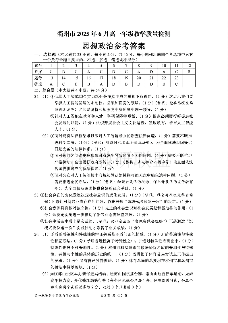 衢州市2025年6月高一年级教学质量检测 政治答案.pdf