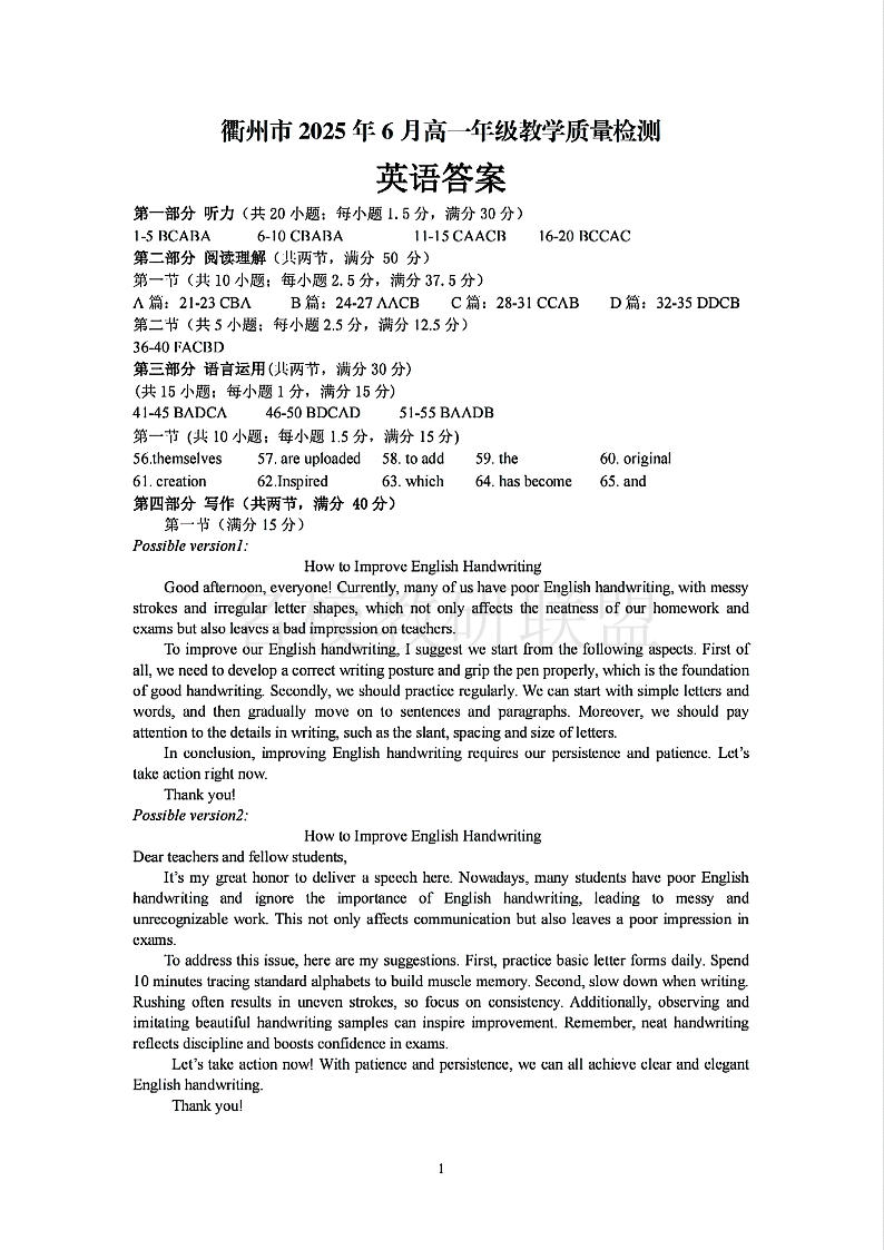 衢州市2025年6月高一年级教学质量检测 英语答案.pdf