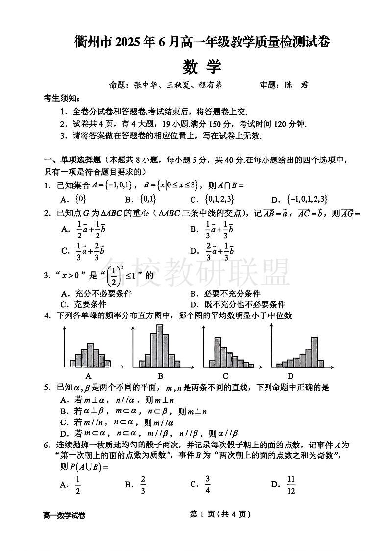 衢州市2025年6月高一年级教学质量检测 数学.pdf