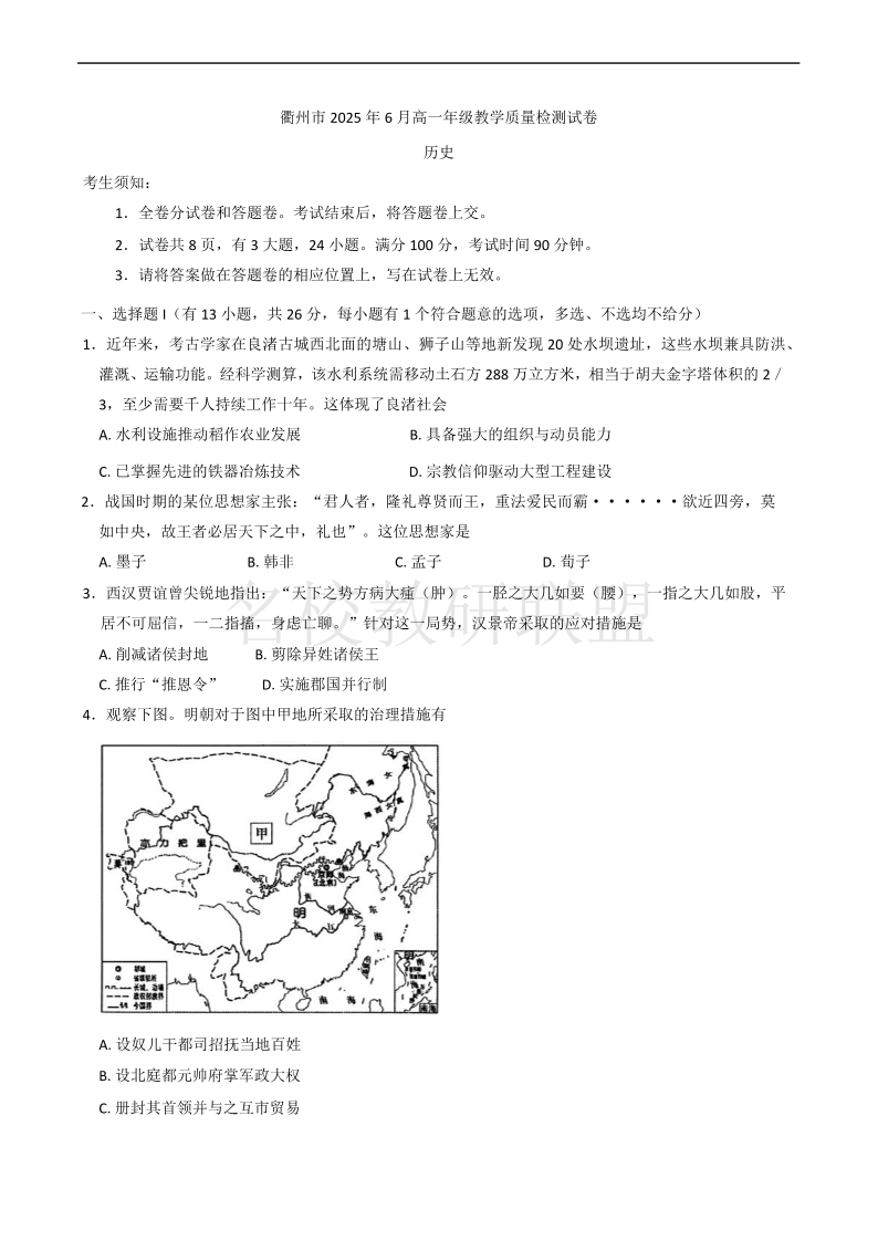 衢州市2025年6月高一年级教学质量检测 历史试题(含答案).pdf