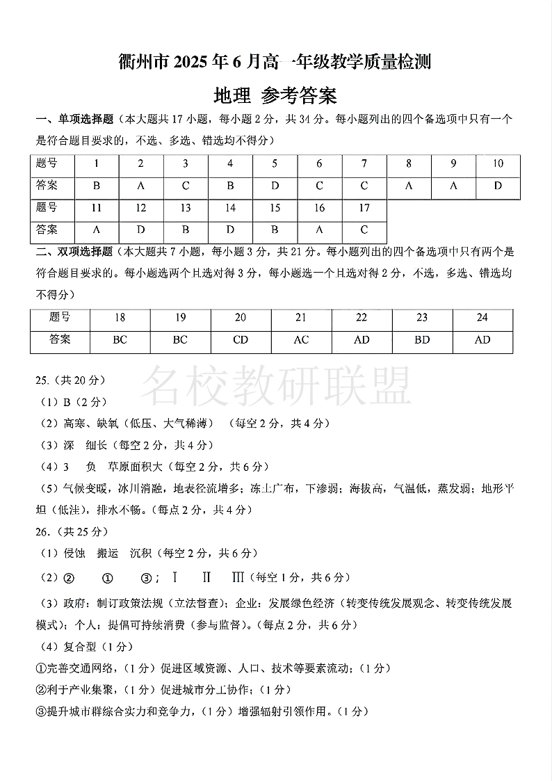 衢州市2025年6月高一年级教学质量检测 地理答案.pdf