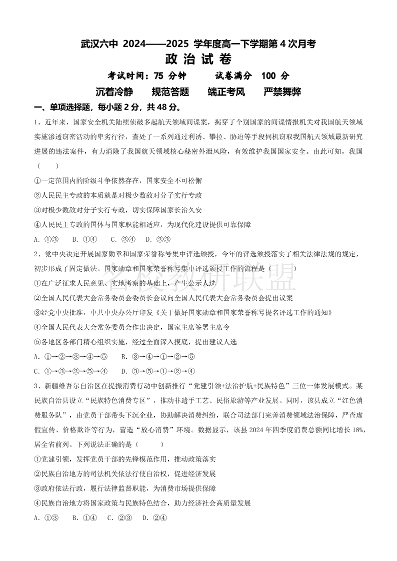 武汉六中2024-2025学年度高一下学期第四次月考 政治.pdf
