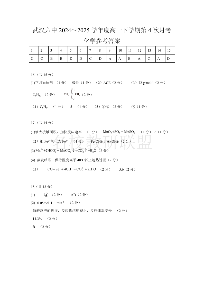 武汉六中2024-2025学年度高一下学期第四次月考 化学答案.pdf